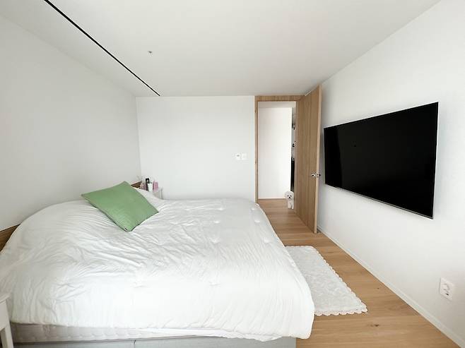 이동을 고려하여 침대 헤드가 없는 파운데이션만 구매해 사용하고 있는데 크게 불편함을 느끼지는 못했습니다. 티비는 65인치 삼성 벽걸이로 원래 집에서 거실에서 사용하던 제품 그대로 사용 중입니다.