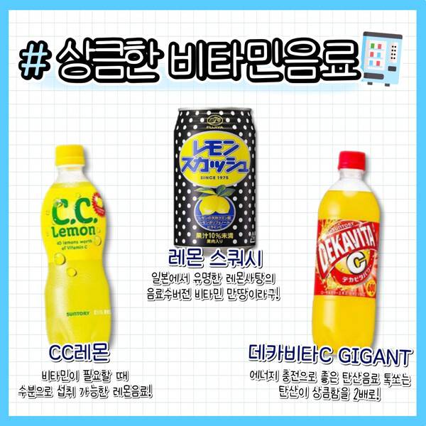 일본 여행시 하루에 기본 만보는 걷게되는데 이때 지친 몸에 급 비타민을 충전하기에 비타민 음료만한게 없습니다. 일본 자판기에서 쉽게 찾아볼 수 있는 비타민음료로는 ' CC레몬 ', 일본에서 유명한 레몬사탕의 음료수버전인 '레몬 스쿼시' 그리고 ' 데카비타C GIGANT'을 추천드립니다.