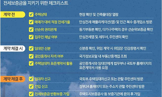 “임대인(대리인) 신분 및 공인중개사 정상 영업 여부 확인이 중요하다. 임대인 본인이나 임대인의 위임을 받은 대리인과 계약을 체결해야 전세사기를 예방할 수 있다. 임대인의 신분증 또는 대리인의 경우 위임장·인감증명서 등을 통해 등기부등본상 임대인이 계약당사자인지 확인하고, 보증금을 입금할 때에도 임대인 명의의 계좌인지 확인 후 이체해야 한다. 주택임대차표준계약서를 사용하고, 계약 후 본인 전세보증금보다 선순위의 담보권 설정을 금지하는 특약을 명시할 필요가 있다. 국토부와 HUG가 출시한 ‘안심전세 앱(애플리케이션) 2.0’을 이용하면 악성 임대인 여부, 보증사고 이력, 보증가입 금지 여부와 함께 국세·지방세 체납 여부도 확인할 수 있다.”
