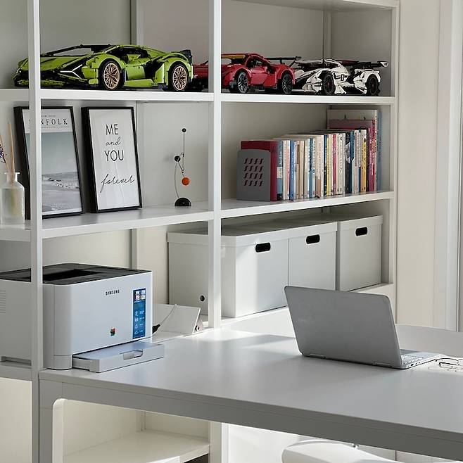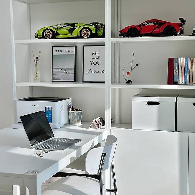 마지막으로 보여드릴 방은 남편의 서재 공간이자 제가 학생들 과외 수업할 때 사용하는 곳입니다. 이 곳도 열심히 숨기기 위해 도어가 있는 책장으로 골랐고요, 오픈된 공간에는 아이가 만든 레고작품들과 책 정도만 올려놓고 작은 물건들은 모두 파일박스와 도어 안으로 숨겼습니다.