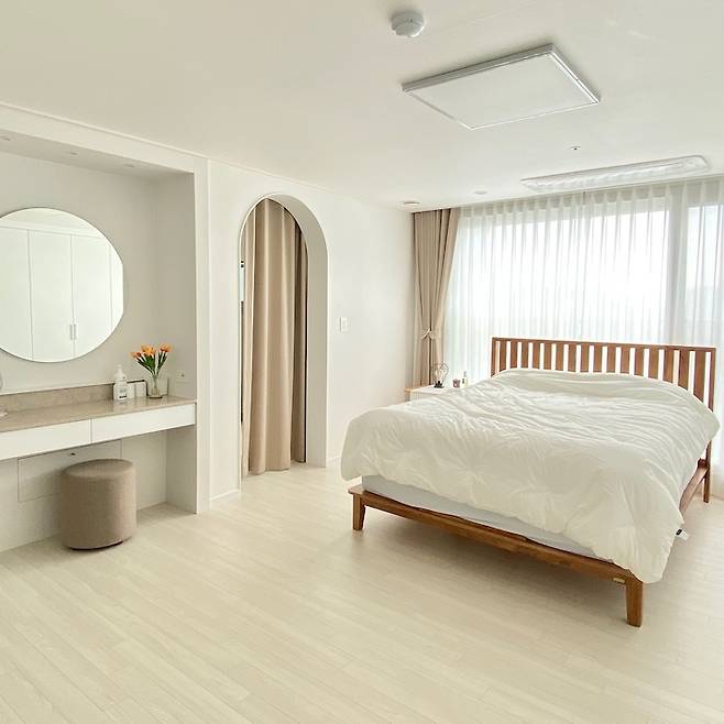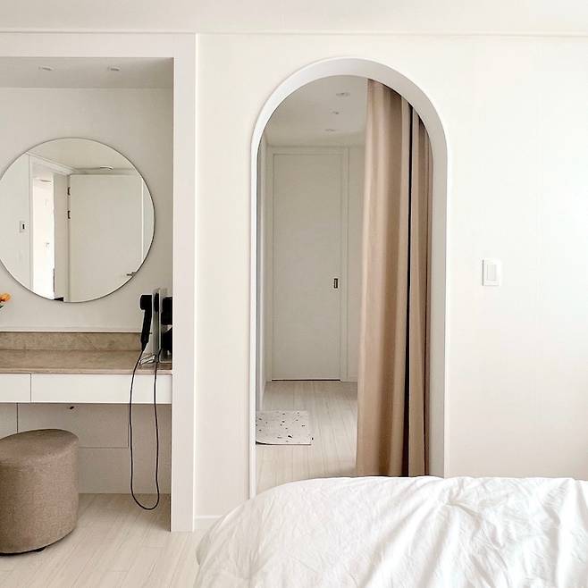 그리고 저희 안방은 구조가 좀 특이한데요. 사진처럼 통로를 지나면 화장실이 있고, 현재 서재로 사용 중인 작은 방과 연결되는 슬라이딩 도어가 있어요. 그 통로의 입구는 아치로 포인트를 주고, 화장실 앞이라 커튼을 설치했어요. 큰 시공은 없었는데 작은 포인트로 많은 분들이 예쁘다고 말씀해주시는 안방이 되었네요^^