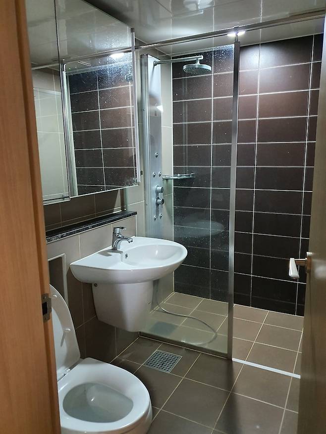 그래서 자주 사용하지 않는 욕조를 거실 화장실로 빼고 안방 화장실엔 샤워기 쪽에 반조적 파티션을 설치했어요. 그래서 거실 화장실은 간단하게 손만 씻거나 가끔 아이가 욕조에서 물놀이할 때만 사용하는 덕에 거의 건식으로 쓰고 있어요.