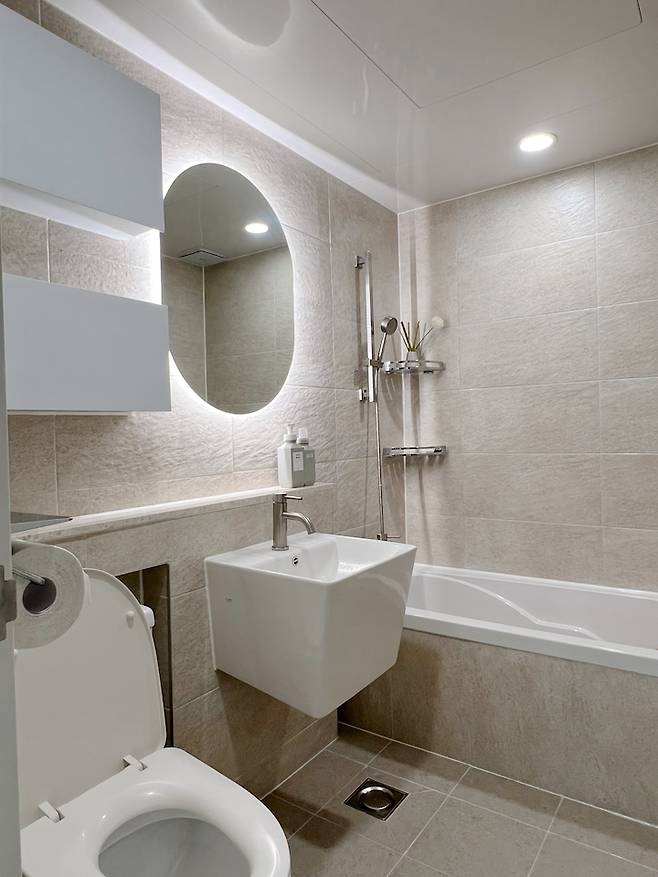 기존의 답답해 보이는 슬라이딩 장은 철거해버린 후 2단 욕실장과 led 타원 거울을 설치했고, 벽 타일과 바닥 타일은 비슷한 톤의 베이지 색으로 선택했어요. 당연히 600각 타일을 하고 싶었지만 '가성비 인테리어'를 해야만 했기 때문에 어쩔수 없이 300각 바닥타일과 직사각 벽타일로 선택했습니다. 그래도 베이지덕후 제 눈에는 꽤 만족스러운 화장실이에요!