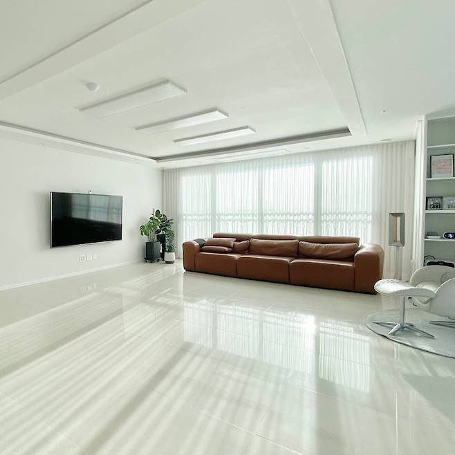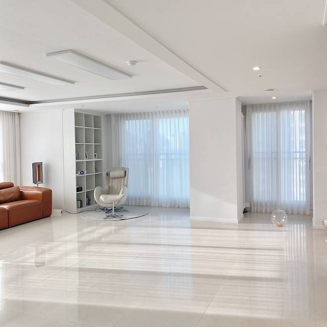 기존 아트월과 기둥에 붙어있던 반짝 반짝한 대리석들은 모두 철거하고 도배로 마감했어요. 하얀 도화지 같은 집을 만들고 싶었거든요. 그리고 싫증 날 때마다 사진처럼 소파나 안마 의자를 옮겨보기도 하면서 살짝씩 변화를 주고 있어요.
