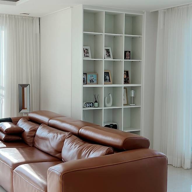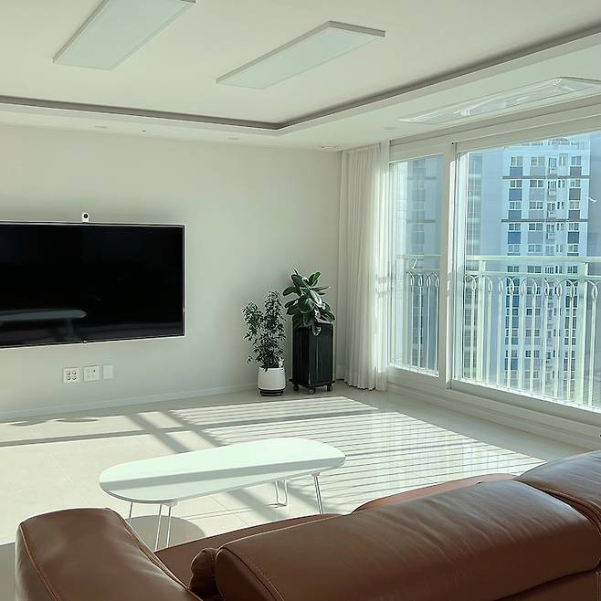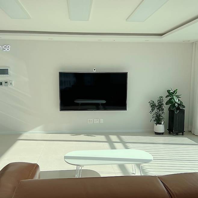 저희 가족은 아직 아이가 어리기도 해서 방보다는 거실에서 온 가족이 옹기종기 붙어서 놀아요. 그래서 거실에는 불필요한 물건들은 없애고 소파와 TV, 안마 의자만 놓고 아주 넓게 넓게 사용하고 있습니다.
