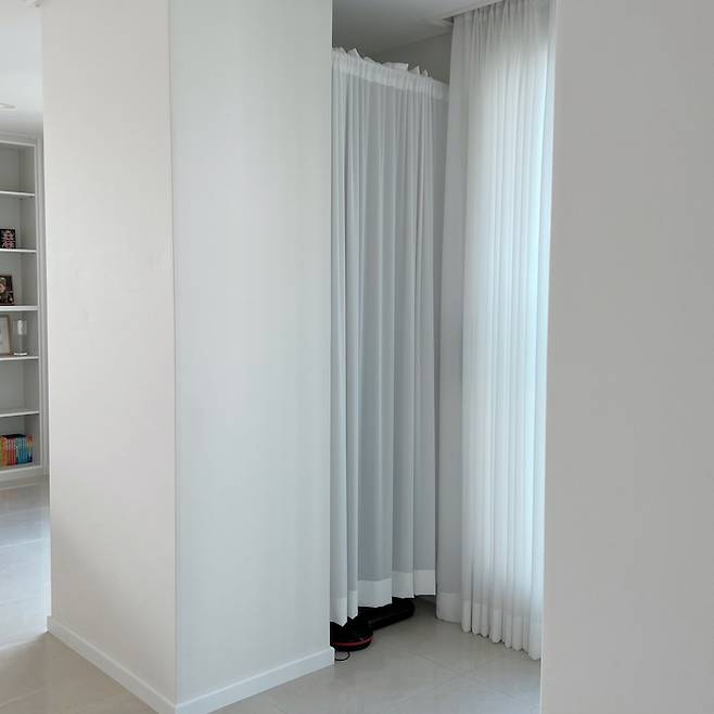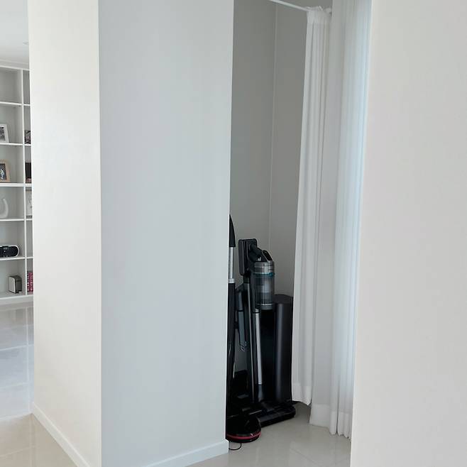 기둥식의 타워형 구조라서 거실 중간 중간에 철거 불가능한 기둥들이 있었어요. 어차피 철거 못할 바엔 활용을 해보자 싶어서 기둥 쪽으로 책장을 짜서 넣었구요. 반대편 기둥 쪽엔 청소기 보관할 공간을 만들고 커튼으로 가려 놓았어요.