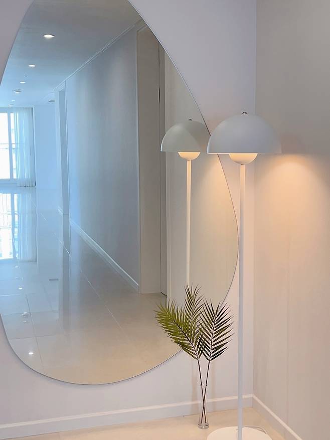 원래 복도의 벽 쪽엔 칙칙한 알판 같은 게 붙어있었는데 모두 다 철거하고 깨끗하게 도배로 마감했고 긴 복도의 반대편 벽 쪽에는 비정형 거울을 부착했어요. 덕분에 긴 복도가 더욱 길어 보여 집도 넓어 보이고 현관 바로 앞이라 외출 전 살펴보는 전신 거울로 사용하고 있습니다. 여기가 저희 집의 거셀존이에요 ㅋㅋㅋㅋㅋ