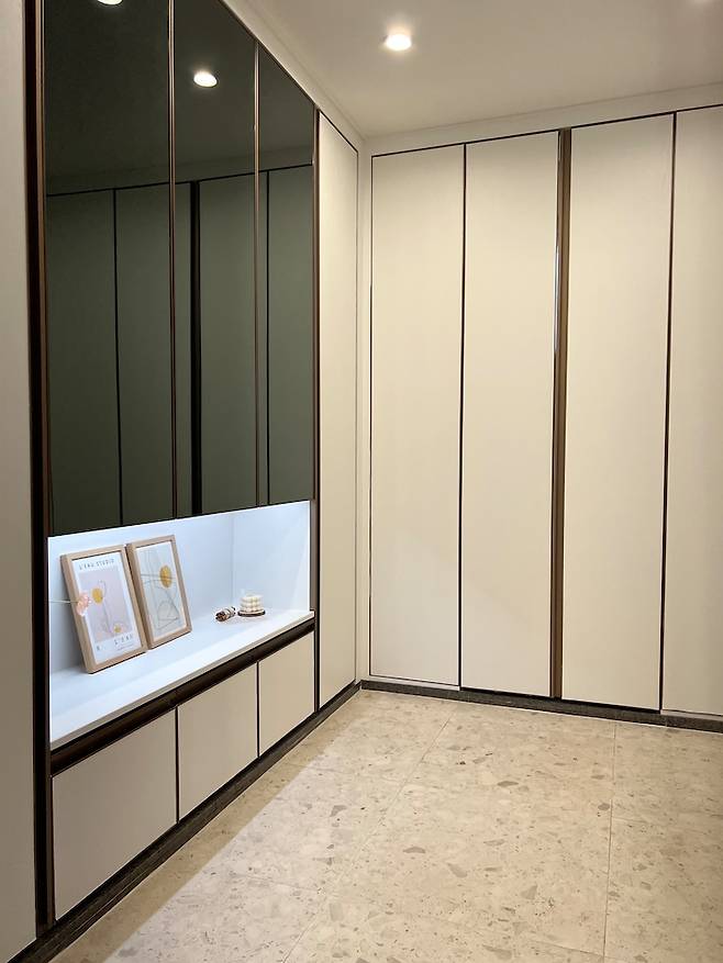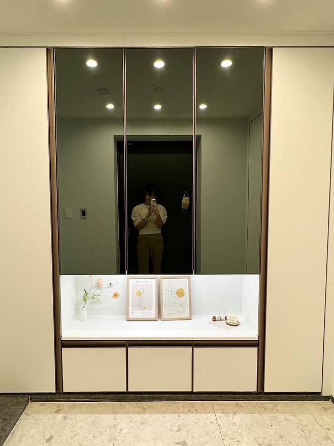 현관은 자꾸 아쉬운 부분만 눈에 들어와서 신발장 중간존이라도 꾸며봤어요. 셀프로 센서 led 선 조명 설치하고 액자와 오브제들을 놓았고 싫증날 때마다 소품들로 분위기를 바꿔주고 있답니다. 바닥 타일은 공사 당시 한창 유행이었던 600각 테라조타일로 했는데 무늬가 많아서 얼룩인지 무늬인지 구별이 안되어 밝은 색이지만 청소를 안해도 티가 덜나는 장점(?)이 있어요 ㅋㅋㅋㅋ