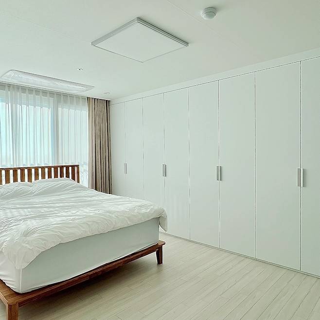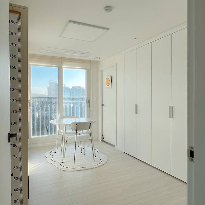 기존 붙박이장은 그대로 살린 채 도어 교체만 진행했고 도배와 마루만 새로 했어요. 사실 벽지를 고르면서 아이방이니까 포인트 색상을 넣어줄까 잠깐 고민했지만 '하얀 도화지 같은 집'을 다시 한번 새기며 모든 방을 하얀 벽지로 했습니다.