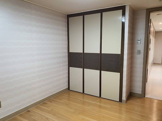 거실과 복도의 폴리싱 타일은 기존의 것을 살리는 대신, 방들의 마루는 상태가 너무 안 좋아서 전부 밝은 색으로 교체하고 안방 한 쪽 벽엔 길게 붙박이장을 설치했어요.