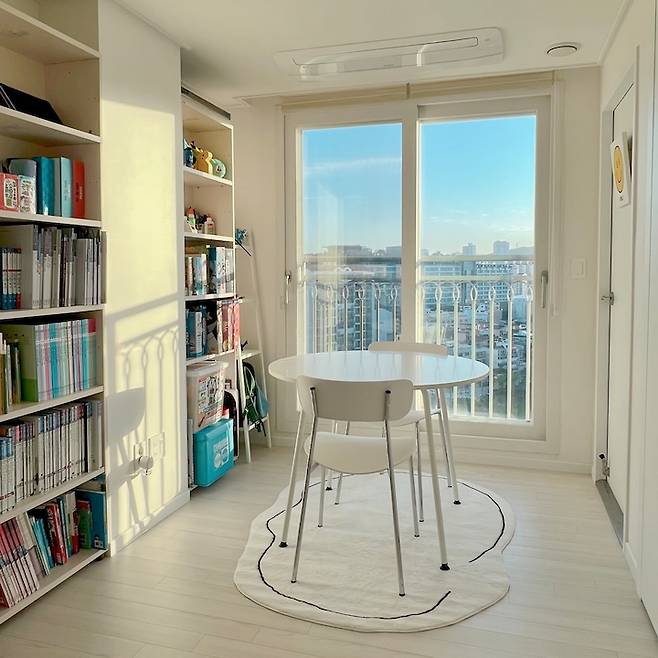 그래서 내린 결론은 책상을 벽에 붙여야 한다는 편견을 버리자! 였어요. 다행히 이전 집에서 쓰던 책장이 사이즈가 딱 맞아서, 기둥이 있는 벽 쪽은 책장으로 채우고 가운데에 1000 사이즈 원형 테이블을 놓아 아이가 공부나 만들기 등을 할 때 사용하고 있는데 결과적으로는 대만족입니다.