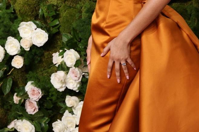 시선이 집중된 곳은 우아한 드레스나 짧게 자른 단발머리 등이 아닌 바로 왼손 약지에 끼워진 커다란 약혼 반지였습니다.