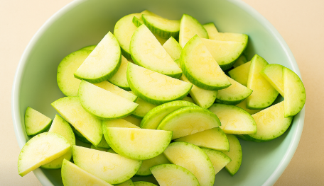 애호박은 양 끝을 자르고 3mm 두께로 반달 모양으로 썰어주세요.채 썰지 않고 두께감 있게 써는 것이 쪘을 때 더 아삭한 식감을 살려줘요.👉 속이 너무 물컹하면 살짝 도려내도 좋아요.
