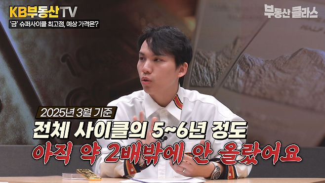 금은 보통 한번 오를 때 짧게는 9년에서 길게는 13년까지 오르는 긴 추세선을 가지고 있다고 합니다. 금의 전체 사이클을 봤을 때 지금은 절반을 갓 지난 수준이라고 하는데요, 금의 슈퍼사이클은 2019년부터 시작된 것으로 보고 앞으로 5~6년은 더 오를 여지가 있다고 조규원 대표는 분석합니다.