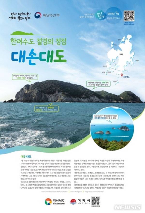 ‘7월의 무인도서’로는 경남 거제시 남부면의 대손대도가 선정됐다. 다포리 홍포선착장에서 남쪽으로 약 3㎞ 떨어진 곳에 자리하고 있으며 삿갓이 바다 위에 솟아있는 듯한 모습을 보인다. 암석해안으로 이뤄진 까닭에 수직절리, 해식애, 해식동 등 다양한 지형이 발달한 것이 특징이다. 섬 육상부에는 높이 7~9m의 후박나무군락, 곰솔군락 등이 분포되어 있다. 주변 해역에는 다양한 무척추동물과 해조류가 자생한다.