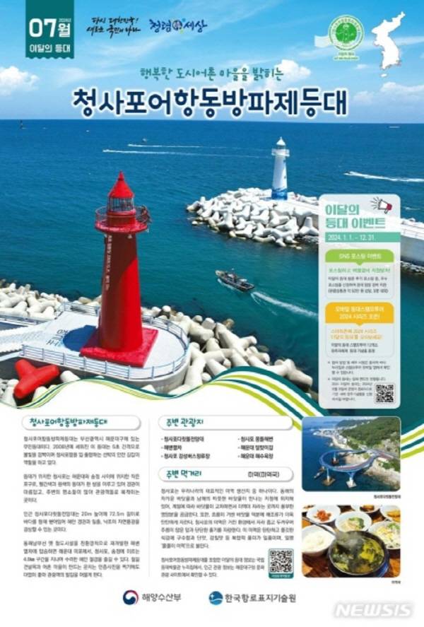 30일 해양수산부는 이곳을 ‘7월의 등대’로 선정했다. 등대는 지난 2008년에 세워졌다. 5초 간격으로 불빛을 깜빡이면서 청사포항에 드나드는 선박의 안전 길잡이 역할을 한다. 빨간색과 흰색의 등대가 한 쌍을 이루고 있는 것이 특징이다.