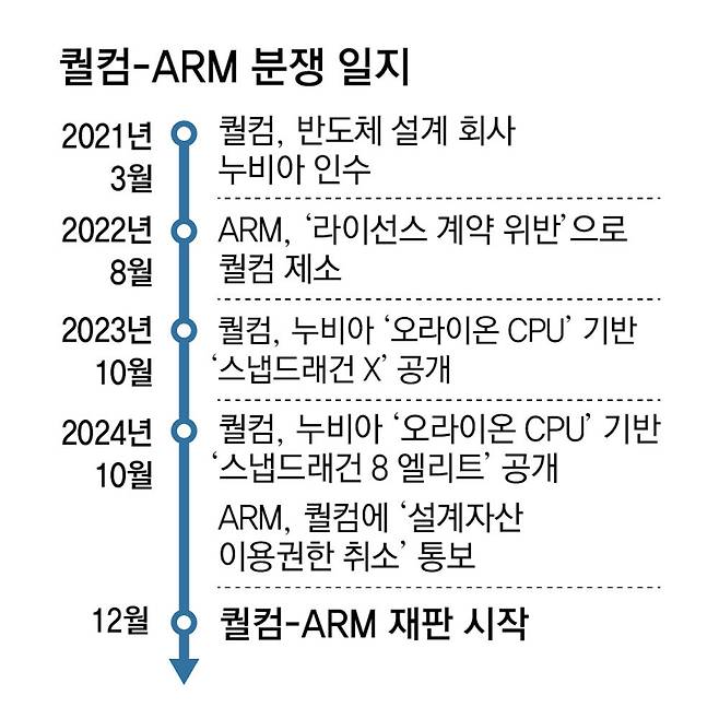 양측의 갈등은 2021년 퀄컴이 반도체 설계기업 누비아를 인수하며 시작됐다. 그동안 ARM의 설계도를 보고 중앙처리장치(CPU)를 설계하던 퀄컴이 자사 칩에 누비아의 ‘오라이온 CPU’를 쓰겠다며 사실상 자립을 선언한 것이다.