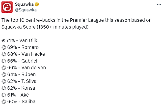 축구 통계 매체 '스쿼카'는 2일(한국시간) SNS를 통해 프리미어리그 센터백 상위 10명의 순위를 매겼다. 대상은 1350분 이상 출전한 선수다. 항목은 공중볼 경합, 태클 성공 횟수, 슈팅 차단, 긴 패스 정확도 등이었다.