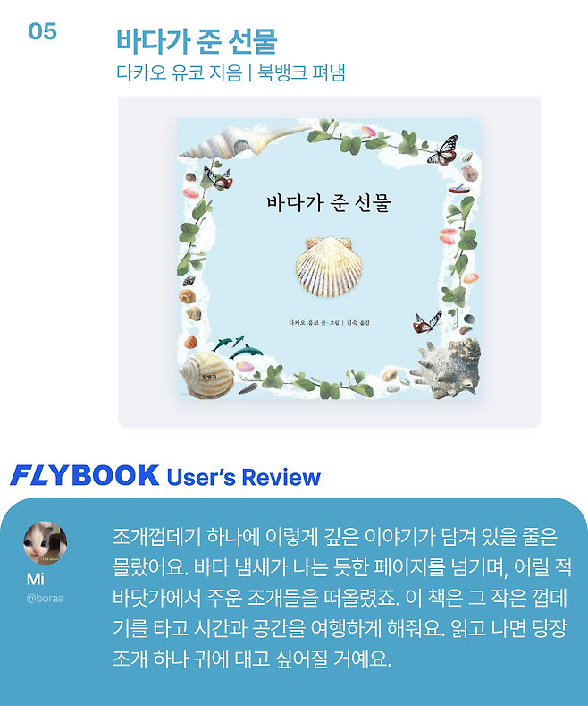바다 냄새가 나는 듯한 페이지를 넘기며, 어릴 적 바닷가에서 주운 조개들을 떠올렸죠.