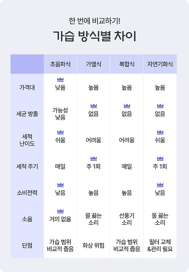 초음파식? 가열식? 복합식? 자연식? 당최 무슨 소리인지 모르겠고, 제품 설명을 읽어 봐도 다들 자기가 최고라고 얘기하니 혼란스러워지기 시작하죠.