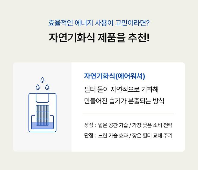자연기화 방식은 쉽게 생각하면 빨래를 널어서 말리는 것과 같아요. 깨끗한 물을 증발시킨 다음 팬을 통해 밖으로 내보내는 방식이죠.