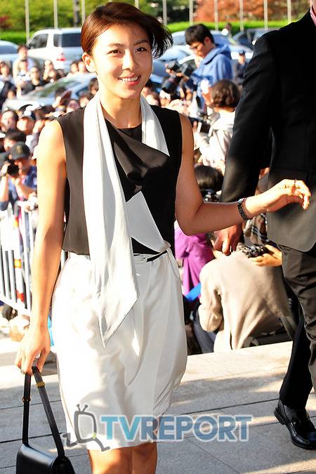하지원은 블랙 슬리브리스 블라우스와