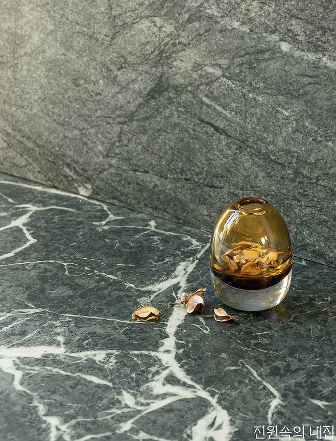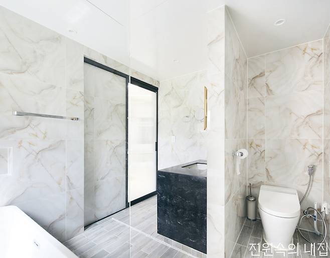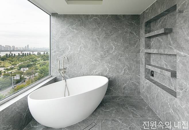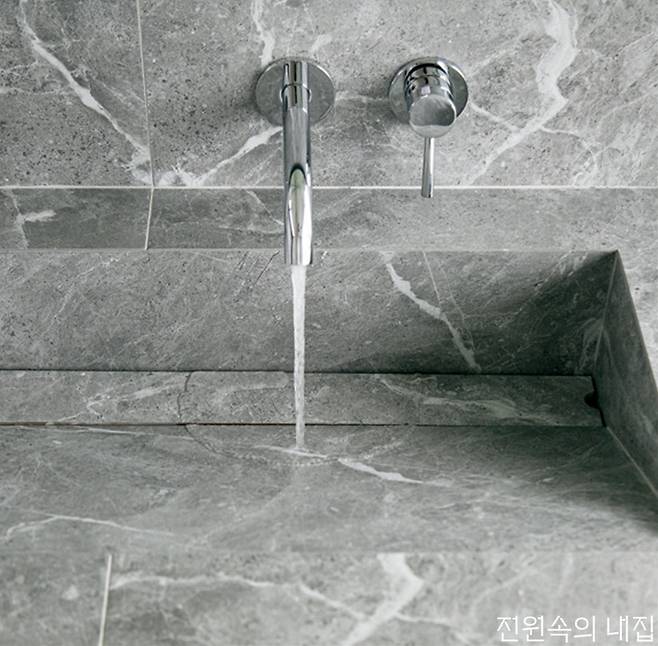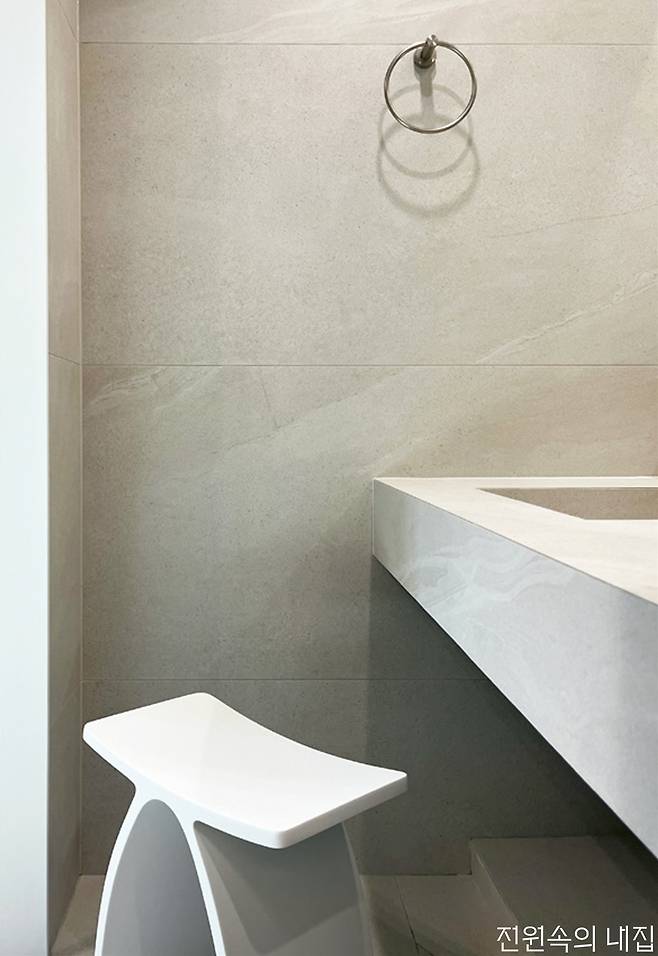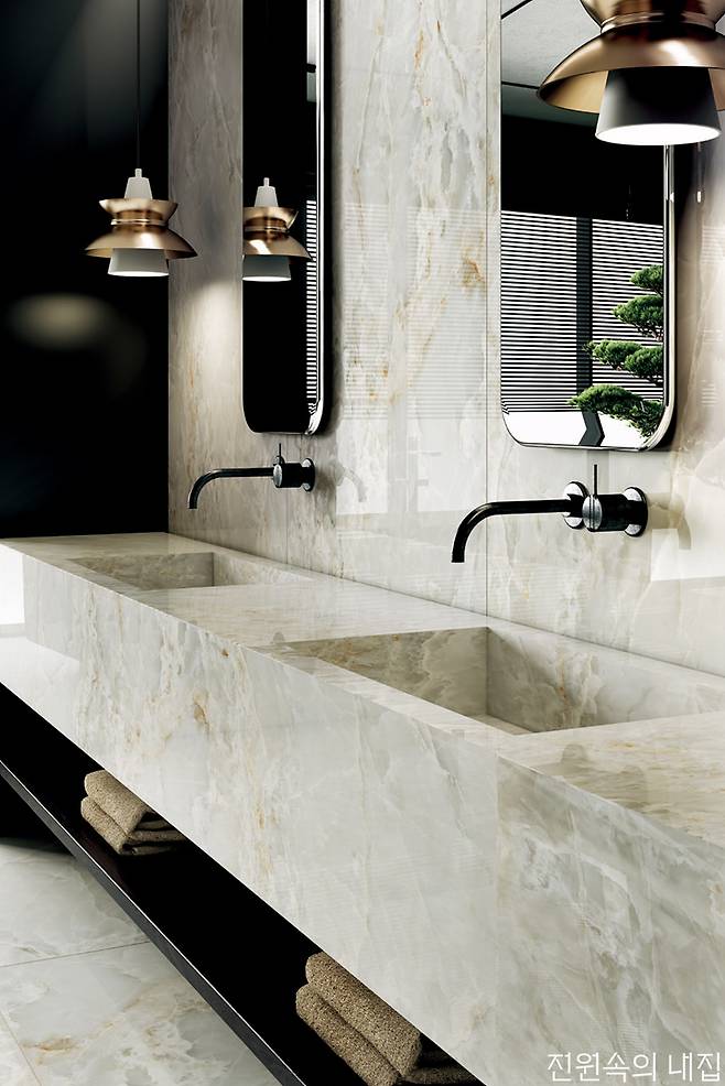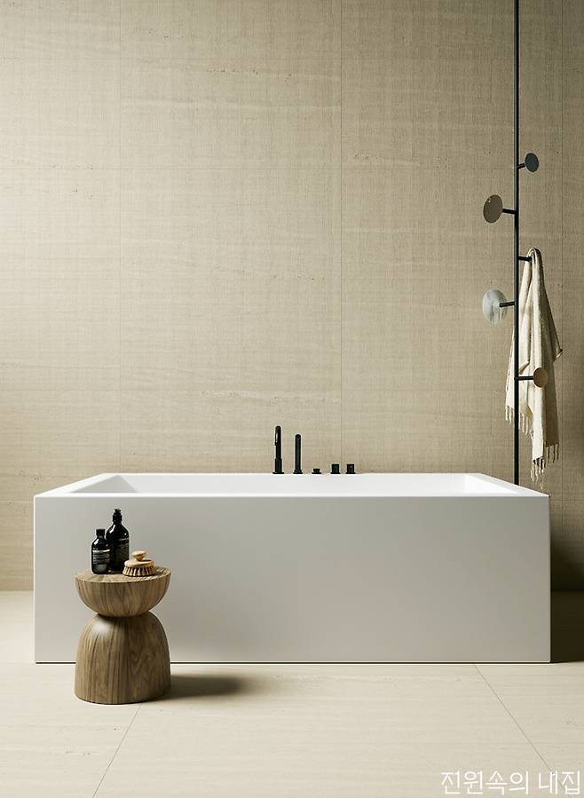 대리석 패턴, 내추럴한 석재 패턴 등의 타일로 가장 자연과 가까운 모양을 욕실에 끌어와 우아하고 아늑한 공간을 완성한다. 같은 패턴이어도 질감에 따라 다른 느낌을 줄 수 있다. 유광은 차갑지만 조금 더 럭셔리한 느낌을, 무광은 차분하고 부드러운 느낌을 준다.
