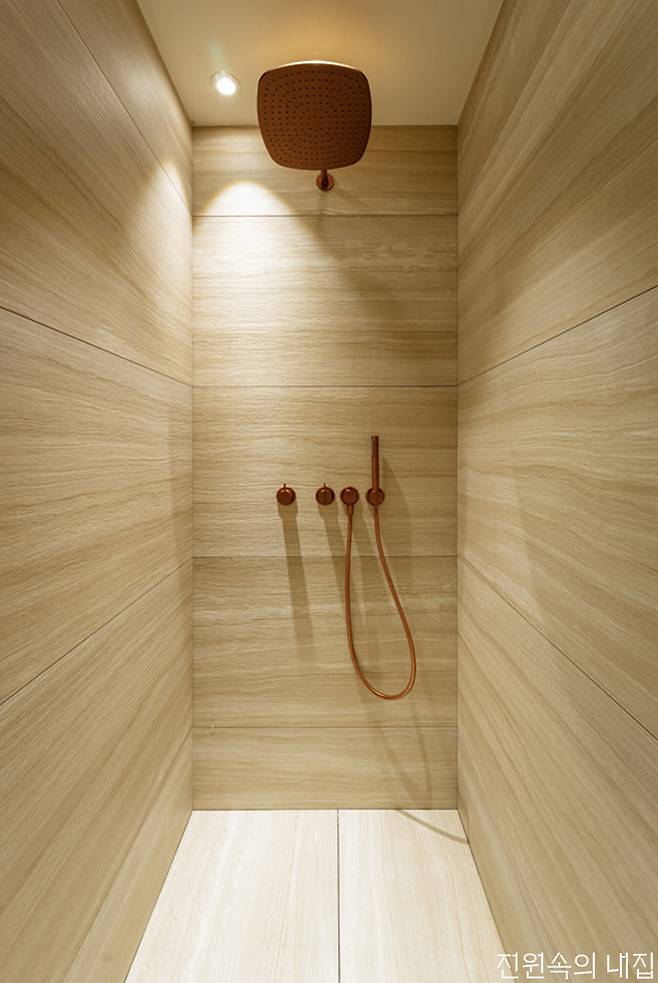 대리석 패턴, 내추럴한 석재 패턴 등의 타일로 가장 자연과 가까운 모양을 욕실에 끌어와 우아하고 아늑한 공간을 완성한다. 같은 패턴이어도 질감에 따라 다른 느낌을 줄 수 있다. 유광은 차갑지만 조금 더 럭셔리한 느낌을, 무광은 차분하고 부드러운 느낌을 준다.