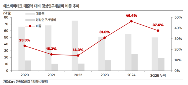 에스비비테크의 매출액 대비 경상연구개발비 비중은 2025년 3분기 누적 기준 약 38%에 달한다. 다만 높은 경상연구개발비 비중은 매출액이 낮은데 기인한다. 2025년 1~3분기 매출은 50억원, 경상연구개발비는 19억원으로 저조했다.