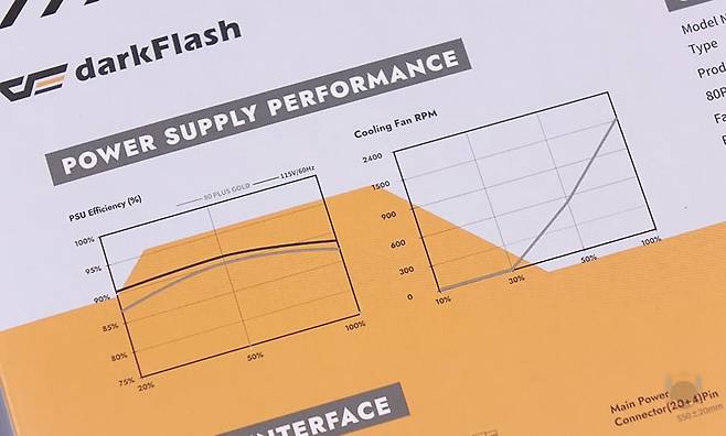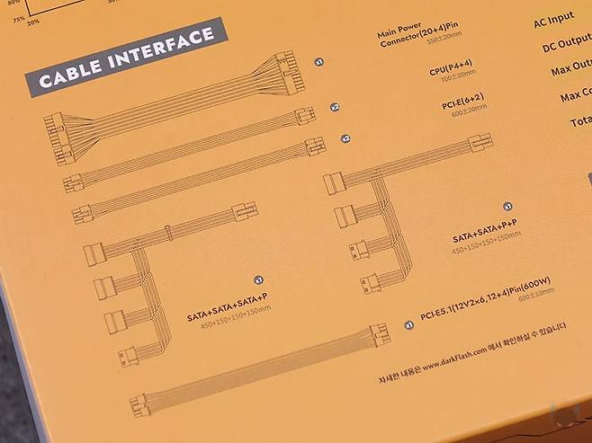 박스 후면에는 오른쪽에 제품의 기본 사양표기를 해놨는데, 크기부터 팬, 캐패시터, 보호회로 기술 등 상세하게 표기해놨습니다. 그리고, 바로 왼쪽에는 전력효율과 뒤에서 다시 언급하겠지만, 제로팬 모드를 지원하고 있어서 팬 작동 그래프 표기도 확인할 수 있으며, 아래에는 해당 모델의 케이블 길이 및 커넥터 지원 개수를 확인할 수 있죠. 또한, 방금 언급했던 박스 전체 밀봉처리 외에도 박스 오픈 부분에 동봉씰 적용도 확인할 수 있습니다.