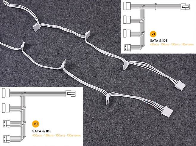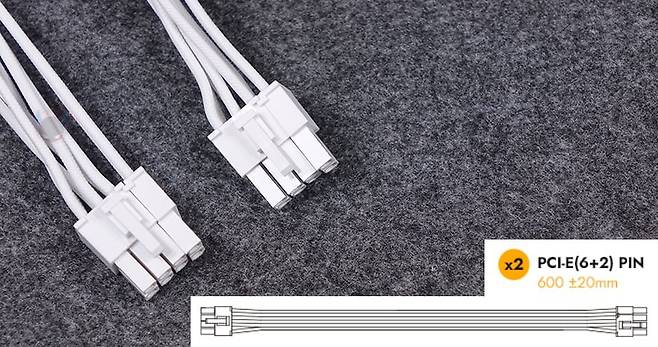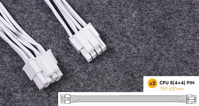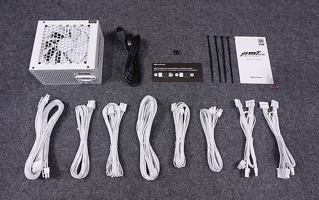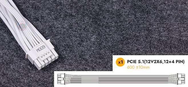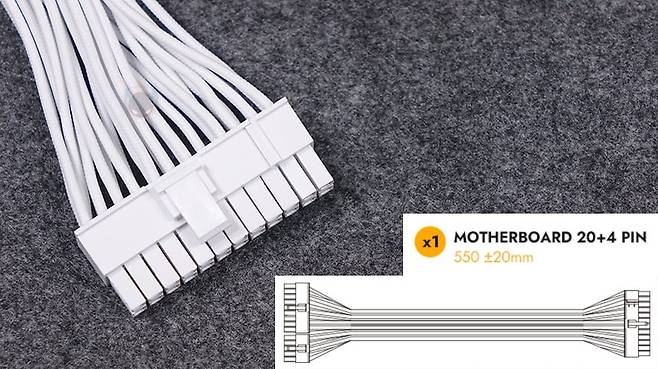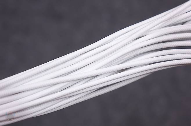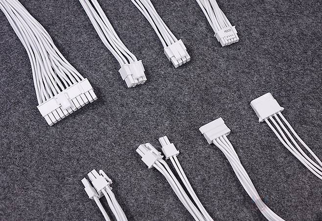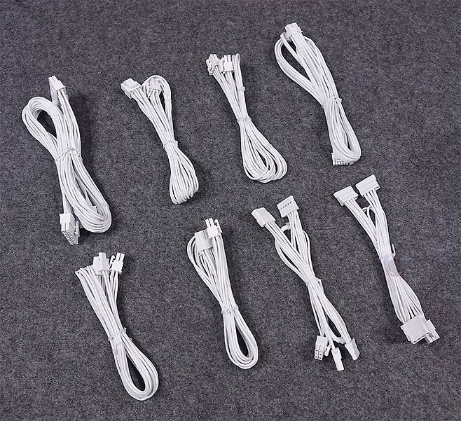 그리고, 퍼펙트모스트 750W 80Plus 골드 풀모듈러 ATX3.1 화이트 파워서플라이의 분리형 케이블은 총 8개 구성으로, 외관상으로 이번 제품에 가장 눈에 띄는 부분이기도한데, 바로 케이블 전선에 메쉬 패턴의 슬리빙이 처리된 케이블입니다. 기존 케이블들은 일자형으로 붙어있는 플랫타입이거나 기본 케이블 피복에 슬리빙이 처리된 방식 2가지정도였는데, 이번 퍼펙트모스트 시리즈에선 하이엔드 제품이나 커스텀 제작으로 판매되는 고급형 파워서플라이 케이블에서 볼 수 있는 가장 깔끔한 슬리빙처리방식의 케이블을 적용했습니다. 플랫타입보다 더 유연하면서도 피복+슬리빙 케이블보다는 얇죠. 그리고, 제품 색상에 맞춰서 커넥터 색상도 통일해, 화이트 모델에는 화이트색상 커넥터가 적용되었습니다. 이부분 역시 UPMOST 시리즈보다 개선된 부분이고, 케이블 전반적인 길이들도 요즘 PC케이스에 맞춘거라 충분한 길이를 가졌습니다.