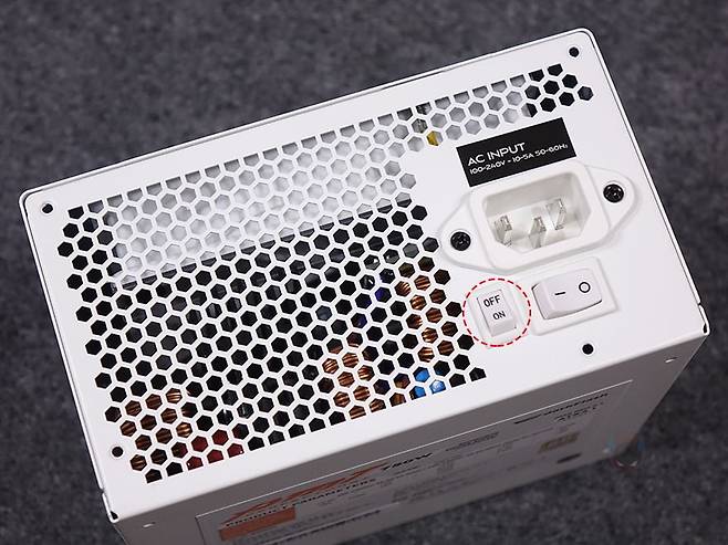 그럼, 다크플래쉬의 퍼펙트모스트 750W 80Plus 골드 풀모듈러 ATX3.1 화이트 파워서플라이를 살펴보면, 전반적인 외관 디자인은 자사의 앞전에 나왔던 UPMOST 모델과 유사합니다. 살펴보면서 하나씩 언급하겠지만, 좀 더 완성도를 높였다고 보면 되죠. 일단, 퍼펙트모스트 시리즈 역시 최근 ATX 파워시장의 트렌드 '컴팩트 사이즈' 따라 140mm 깊이로 출시했습니다. PC케이스에서 최대한 공간차지가 최소화되도록 했죠. 그리고, 상단에는 사각 패턴 디자인의 에어홀을 적용했는데, UPMOST 모델과 동일합니다. 다만, UPMOST 모델에서는 내부 팬이 외형 색상과 상관없이 블랙이었던 반면에, 이번 퍼펙트모스트에선 외형 색상에 맞춰서 팬 색상도 동일하게 맞추고 있습니다. 그래서, 화이트 제품에는 화이트색상의 120mm 팬이 적용되어 있죠. 그리고, 바깥쪽 후면부에는 벌집 모양의 에어홀 처리와 함께 에코팬 모드 On/Off 스위치가 적용되어 있는데, 흔히 말하는 제로팬 모드라고 보면 됩니다. 에코팬 모드를 켜면 일정 온도에 도달하기 전까지는 팬이 움직이지 않는 무소음으로 작동하고, 에코팬 모드를 끄면, 전원이 들어오는 동시에 팬이 작동하는 거죠.