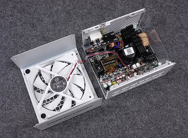 퍼펙트모스트 750W 80PLUS골드 풀모듈러 ATX3.1 화이트 본체의 내부를 잠깐 살펴보면, 앞서 언급했듯이 쿨링 역할의 120mm 팬은 제품 색상에 맞춰 화이트 팬을 적용하고 있으며, 최근 파워서플라이 제품들에 많이 사용되는 저소음의 FDB베어링 팬을 사용했으며, 팬 제품은 HONG HUA사 제품으로 기본 2000 RPM 속도를 가진 베이스 모델에서 파생된 제품을 사용했고, 여기에 앞서 언급했듯이 에코팬 모드를 지원하고 있어서 자동속도조절로 작동됩니다. 또한, 공기흐름 유지를 위해 한쪽에는 에어가이드도 장착되어 있죠. 육안으로 확인할 수 있는 내부들을 보면, 알루미늄 방열판과 함께 주변으로 일본산 420V/560㎌ 용량의 메인 캐패시터가 배치되어 있으며, 과부하/과전류 없이 안정적인 전력공급을 위한 스위칭트랜스, 12V 싱글레일로 최대 전력공급과 부하가 낮도록 DC to DC 설계를 적용했으며, 고주파음 최소화의 EMI 필터, 내부전류흐름방지를 위한 접지 등을 확인할 수 있습니다. 참고로, 보호회로도 앞서 기본 사양표기에서 총 7가지가 적용된 것을 확인할 수 있었는데, 앞선 모델인 UPMOST 시리즈보다 1개 더 많은 NLP(무부하 보고)가 추가되었고, 산업 장비에 적용되는 4KV 수준의 서지 보호 기능도 이번에 추가되었습니다.