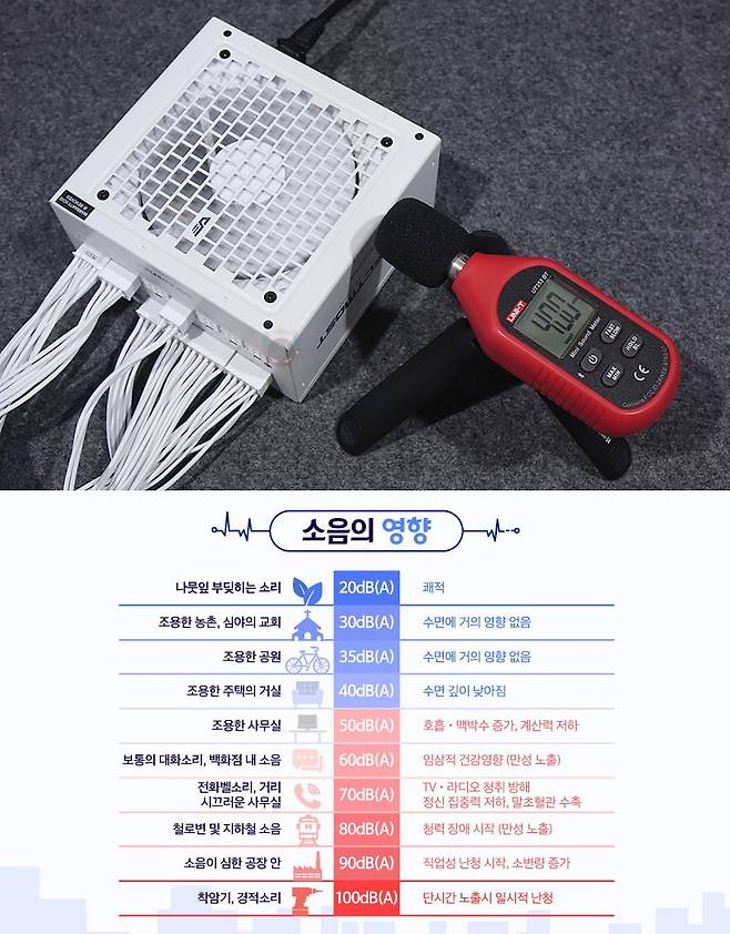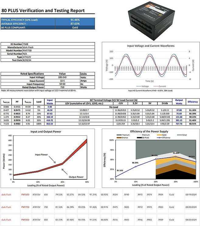 끝으로, 이번 퍼펙트모스트 시리즈 파워서플라이는 앞서 제품박스에서 확인했듯이 80Plus 골드등급 인증을 받았습니다. 실제 80Plus 공식홈페이지에 등록된 750W 용량의 퍼펙트모스트 750W 80Plus 골드 풀모듈러 ATX3.1 파워서플라이의 전력효율 테스트 결과를 확인해 보면, 평균 87.63%, 50% Load 상황에서 91.46%의 전력효율을 보여준 것으로 확인할 수 있어서 낭비되는 소비전력에 대한 걱정은 크게 하지 않아도 되겠습니다. 또한, 앞서 제품 설명서에서 잠깐 확인했듯이 국내외 시장에 아직 출시되지 않은 650W 용량 모델의 결과도 확인할 수 있어서 추후 출시 기대를 해볼 수 있겠습니다. 마지막으로 기본 작동상태에서 팬 소음을 근접상태에서 측정해 보면, 약 40dB(A) 수준으로 정숙한 편임을 확인할 수 있습니다. 실제 PC케이스 내부에 장착되면, 더 낮은 수준으로 들리고, 주변 다른 부품들의 쿨러 팬에 묻힐 정도의 소음이라 본 제품에 대한 팬 소음 걱정은 하지 않아도 됩니다.
