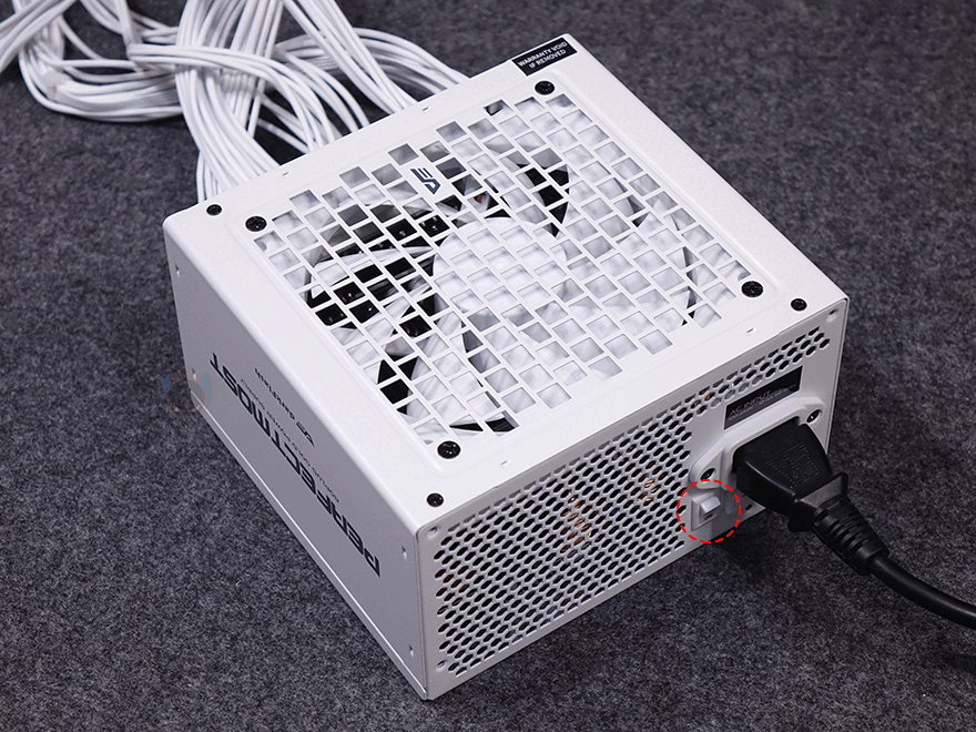 후면부 반대인 전면부에는 앞서 언급했듯이 퍼펙트모스트 시리즈 역시 UPMOST 시리즈와 마찬가지로 풀-모듈러 방식을 적용하고 있습니다. 그래서, 전면부에는 분리형 케이블들과 연결되는 커넥터들이 배치되어 있는데, 커넥터들마다 용도 표기를 해놔서 쉽게 구분할 수 있으며, UPMOST 시리즈에선 외관 색상과 상관없이 블랙색상의 커넥터가 적용되었는데, 이번 퍼펙트모스트 시리즈에는 외관 색상에 맞춰 커넥터도 통일시켰습니다. 그래서, 화이트 모델에는 화이트색상의 커넥터가 적용되어 있죠. 이밖에 본체 측면에는 모델명을, 본체 밑바닥 부분에는 다시 한번 제품의 기본 사양표기를 확인할 수 있습니다.
