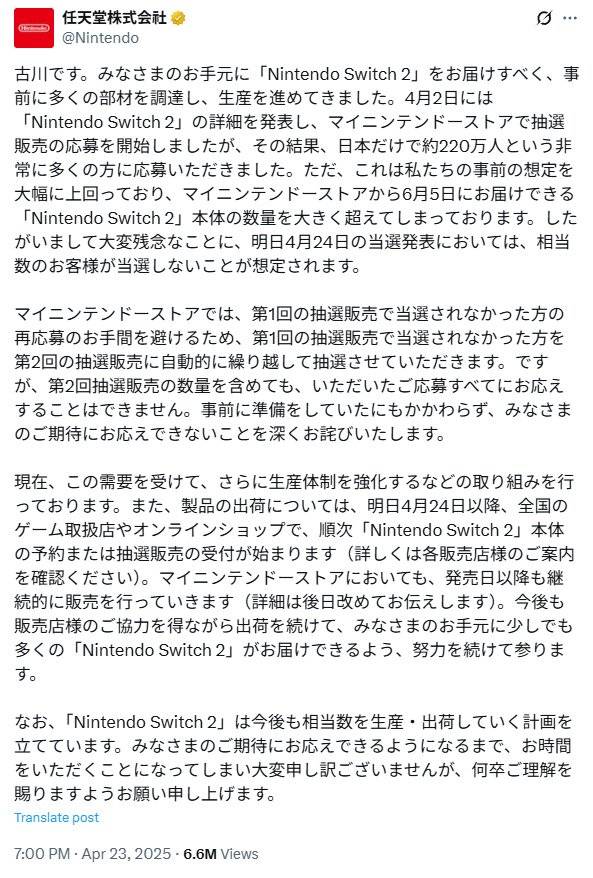닌텐도의 후루카와 슌타로 대표는 오늘(23일), 닌텐도 스위치2의 마이 닌텐도 스토어 일본 사전 응모량이 220만 명 이상이라고 밝혔다. 이를 두고 후루카와 대표는 "사전 예상 수량을 크게 상회한다"며 "마이 닌텐도 스토어에서 6월 5일 배송 가능한 닌텐도 스위치2 본체 수량을 크게 초과했다"고 설명했다.