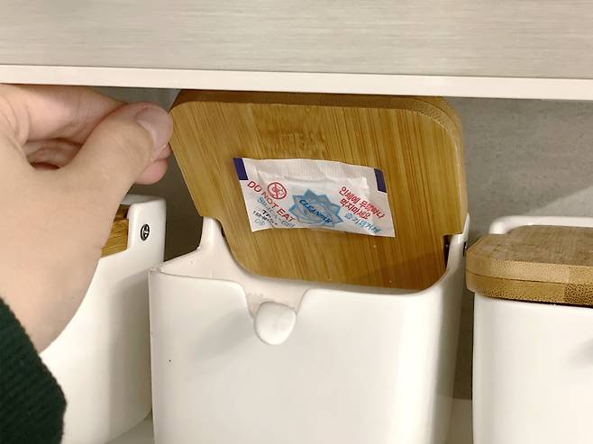 고춧가루나 소금, 설탕 등 가루 양념들은 습기에 취약해 매번 딱딱하게 뭉쳐 요리할 때 곤란한 적이 한두 번이 아닌데요. 실리카겔을 테이프를 사용해 양념통 뚜껑에 부착해 보세요. 실리카겔이 습기를 빨아들여 가루 양념이 뭉치지 않도록 도와줘요.