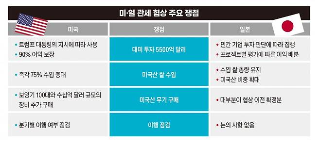 ‘9대 1’이라는 투자 이익 배분에 대한 뉘앙스도 다르다. 백악관은 “투자에서 발생하는 이익의 90%는 미국 몫”이라고 주장했다. 그러나 아카자와 경제재생상은 “프로젝트별 평가 결과 미국 90%, 일본 10%로 설정된 것은 사실이지만 이는 공헌도와 위험 부담을 반영한 것”이라고 설명했다. 이익 배분은 출자 비율에 따라 민간 계약으로 정해진다는 뜻이다. 닛케이는 “실제 배분 구조는 프로젝트별 협상에서 정해질 것”이라며 “이익 배분에 대한 양국의 메시지가 엇갈리면서 향후 마찰이 생길 수 있다”고 전했다.