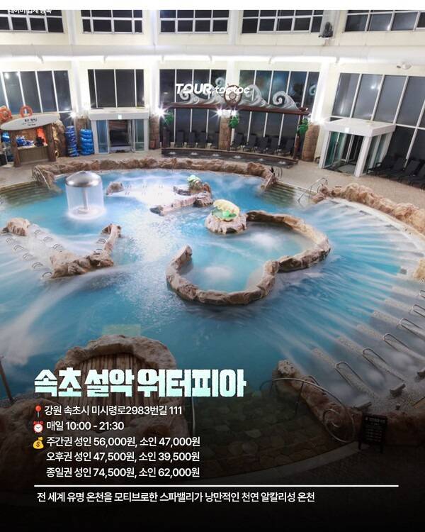 강원도 설악산 자락 아래 위치한 설악 워터피아는 테마형 스파존으로 구성돼, 다양한 온천 경험이 가능합니다.