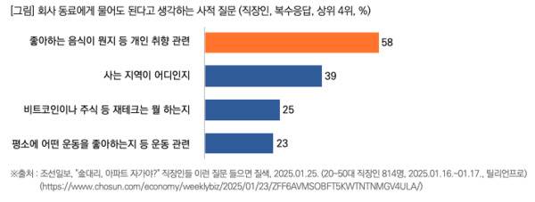 ‘회사 동료에게 물어도 된다는 사적 질문’(복수응답)에 대해서는 ‘좋아하는 음식이 뭔지 등 개인 취향 관련’(58%)이란 응답이 가장 높았고, 이어 ‘사는 지역이 어디인지’(39%), ‘비트코인이나 주식 등 재테크는 뭘 하는지’(25%) 등의 순이었다.