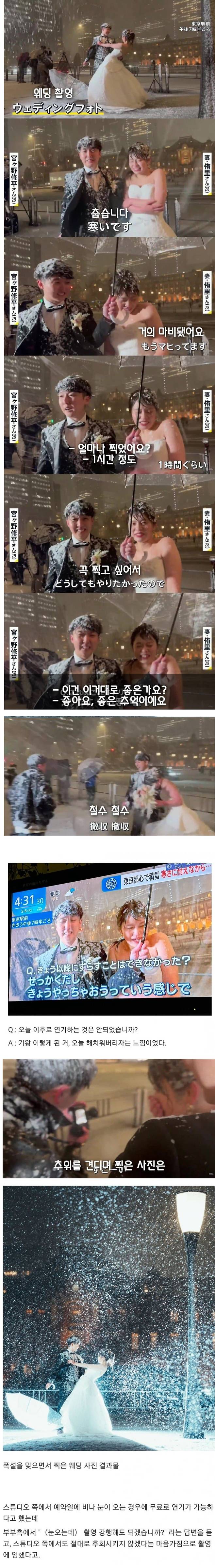 폭설이 내리는 날 야외 웨딩촬영을 한 부부