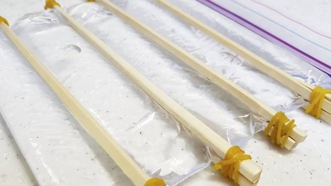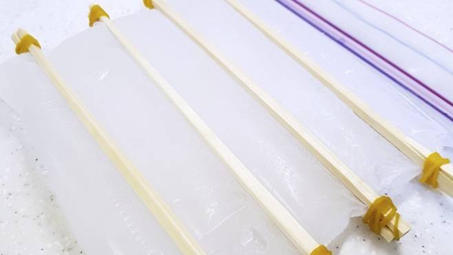이제 지퍼백에 나무젓가락을 이용해 고무줄로 이렇게 고정시켜 그 상태로 얼리면 끝입니다. 이렇게 얼리게 되면 얼음이 길쭉한 모양으로 얼게 되는데요.