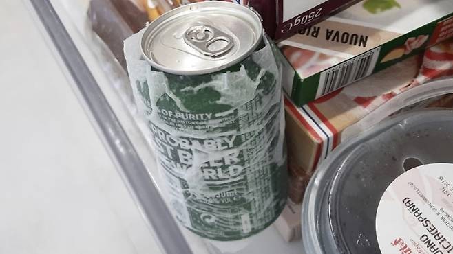 물에 젖은 키친타월이 캔음료의 열을 빠르게 빼앗아 아주 금방 시원해진 음료를 보실 수 있어요.