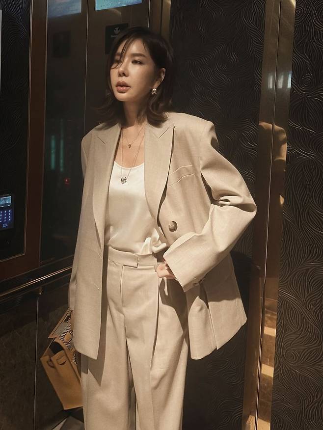 엘리베이터 앞 조명 속에서 클래식하면서도 강렬한 분위기를 자아낸 김준희의 스타일링이 시선을 사로잡는다. 오버사이즈 핏의 버진울 100% 수트는 그녀의 시크한 무드를 극대화하며, 고급 소재 특유의 윤기와 견고한 실루엣이 돋보인다.