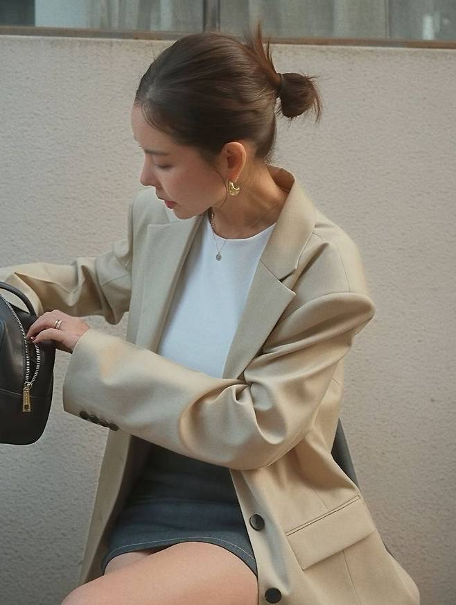 베이지 컬러 수트는 광택 있는 새틴 톱과 조화를 이루며 부드러움과 단단함이 공존하는 인상을 준다. 재킷의 오버사이즈 숄더라인은 자연스러운 권위감을 부여하고, 하이웨이스트 팬츠는 다리 라인을 길어 보이게 한다. 여기에 미니멀한 골드 주얼리와 브라운 톤의 백을 매치해 룩의 완성도를 높였다.