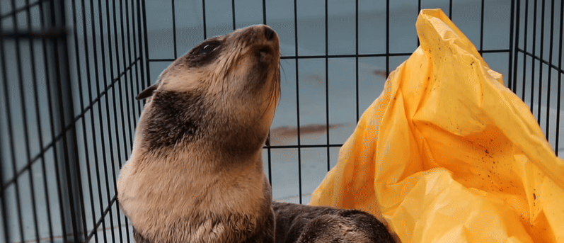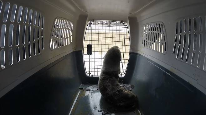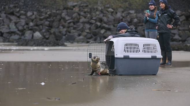 아기 물개는 케이지 안에 담긴 채 밖으로 옮겨지더니 시원한 파도소리가 들리는 해변에 도착했는데요.