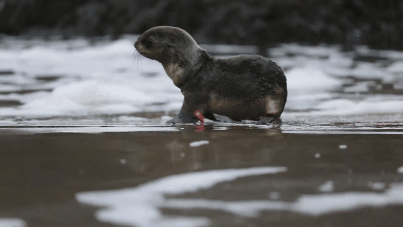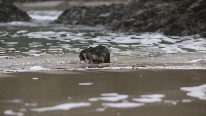 아기 물개는 케이지를 벗어나 씩씩하게 알아서 바다를 향해 나아갑니다.