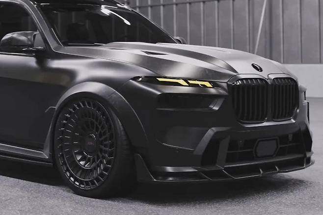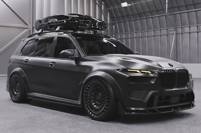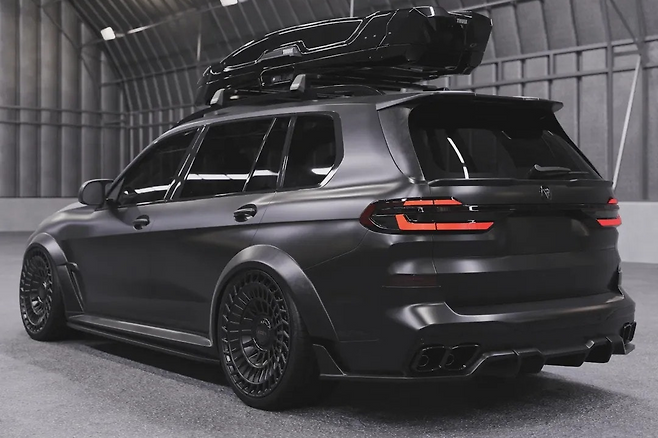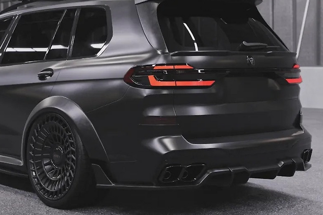 최근 공개된 BMW X7 렌더링은 펜더 플레어와 새롭게 디자인된 후드를 통해 근육질적인 외관을 강조했으며, 두꺼운 친 스포일러와 새로운 디퓨저, 특별한 배기 트림 등으로 시각적 존재감을 한층 높였다. 특히 무광 블랙 랩핑으로 마감된 외관은 차량의 공격적인 이미지를 완성하며, 낮아진 지상고와 독특한 휠 디자인은 스포티한 느낌을 더해준다. 루프에 장착된 박스는 실용성을 높이면서도 전체적인 디자인과 조화를 이룬다는 평가다.