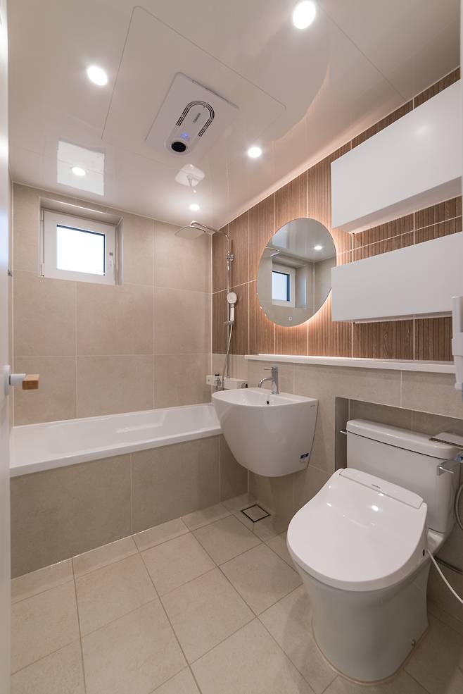 1층 욕실은 따뜻한 톤의 베이지 타일로 연출했다. 전면 벽에 우드 타일을 포인트로 주어 전체적인 우드 컬러의 분위기를 반복함으로써 통일감을 줬다.