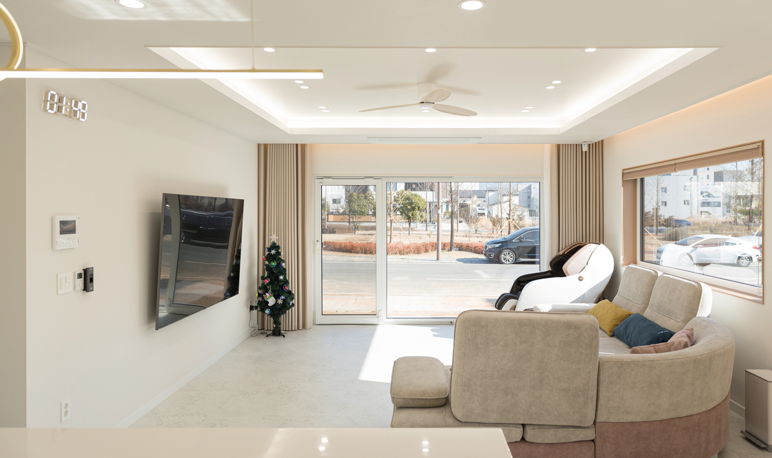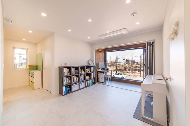 2층으로 진입해 처음 보이는 공간인 가족실은 개방감을 위해 전면에 통 큰 창을 배치했다.